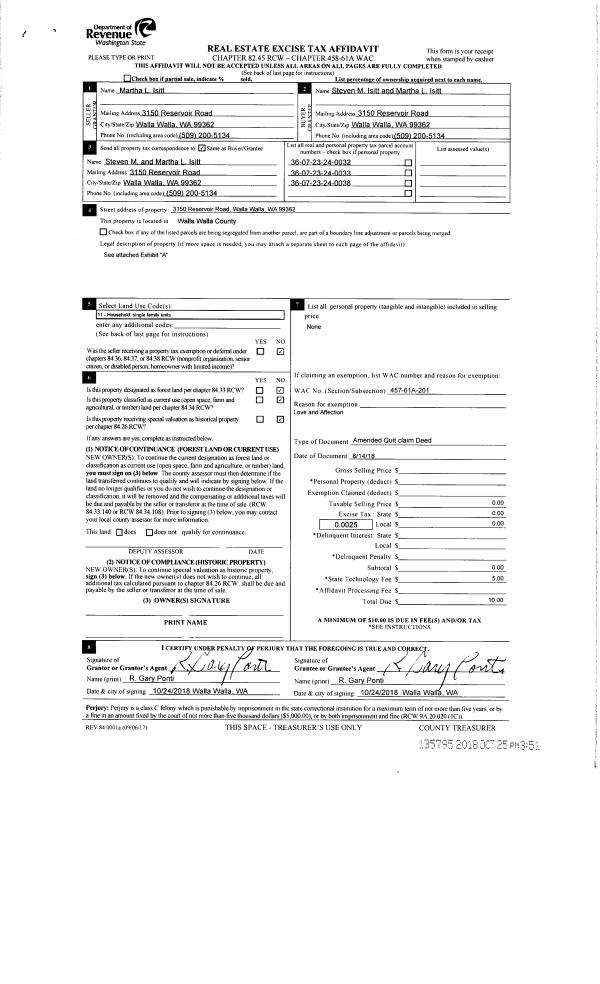 | 1 | 10/24/2018 | QCD | QUIT CLAIM DEED | ISITT STEVEN V & MARTHA L | ISITT STEVEN M & MARTHA L | | | $0.00 | 135795 | 2018-08832 |