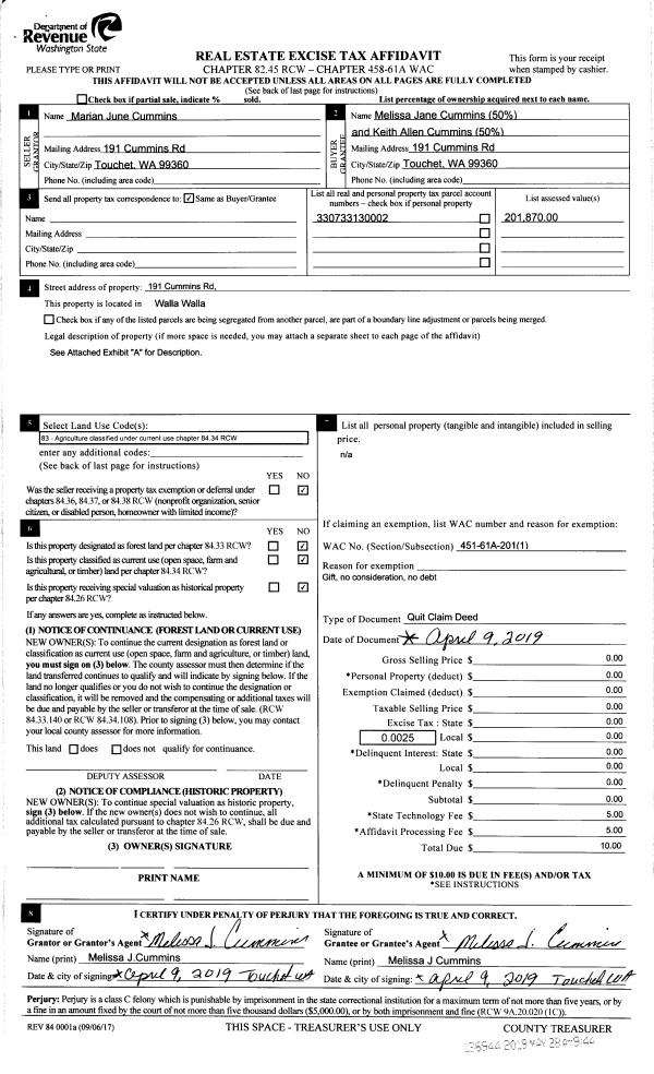 | 1 | 04/04/2019 | QCD | QUIT CLAIM DEED | CUMMINS KEITH ALLEN | CUMMINS FAMILY FARM LLC | | | $0.00 | 136943 | 2019-03540 |