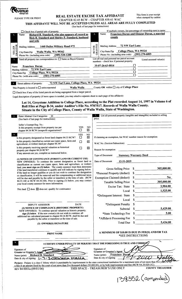 | 1 | 01/03/2020 | SWD | STATUTORY WARRANTY DEED | STANDARD RICHARD B & SHIRLEY P | DURAN FRANCISCO & ELEAZAR | | | $305,000.00 | 138352 | 2020-00042 |