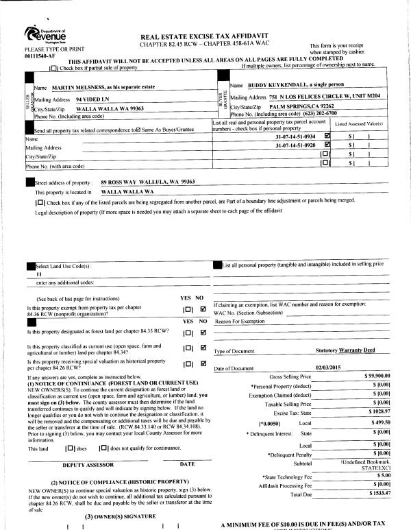 | 2 | 02/09/2015 | SWD | STATUTORY WARRANTY DEED | MELSNESS MARTIN W | KUYKENDALL BUDDY | | 2-PARCELS | $99,900.00 | 127411 | 2015-01286 |