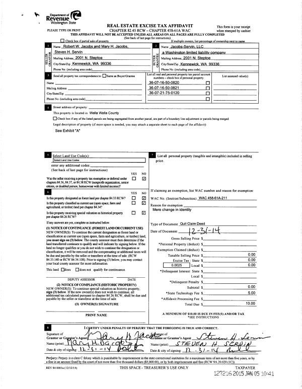 | 2 | 01/05/2015 | QCD | QUIT CLAIM DEED | JACOBS ROBERT W & MARY H | JACOBS-SERVIN LLC | | 3-PARCELS | | 127216 | 2015-00026 |