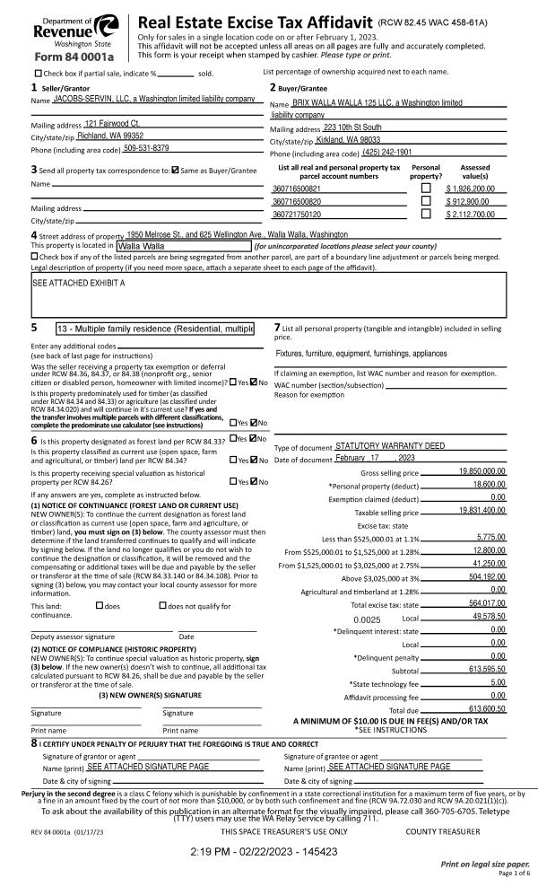 | 1 | 02/17/2023 | SWD | STATUTORY WARRANTY DEED | JACOBS-SERVIN LLC | BRIX WALLA WALLA 125 LLC | | 3-PARCELS | $19,831,400.00 | 145423 | 2023-00879 |