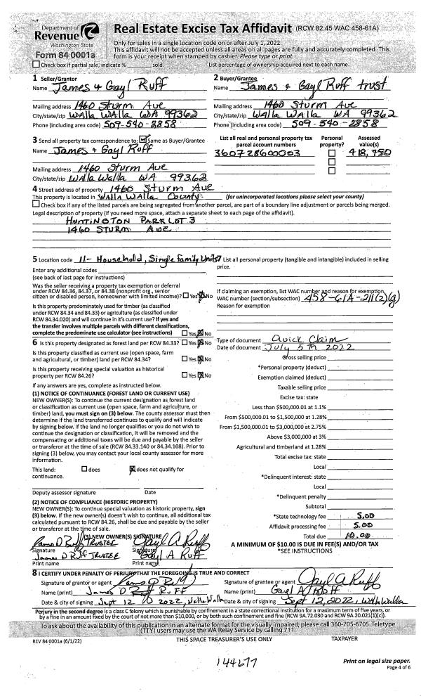 | 1 | 09/13/2022 | QCD | QUIT CLAIM DEED | RUFF JAMES D & GAYL A | JAMES AND GAYL RUFF TRUST | | | $0.00 | 144677 | 2022-07644 |