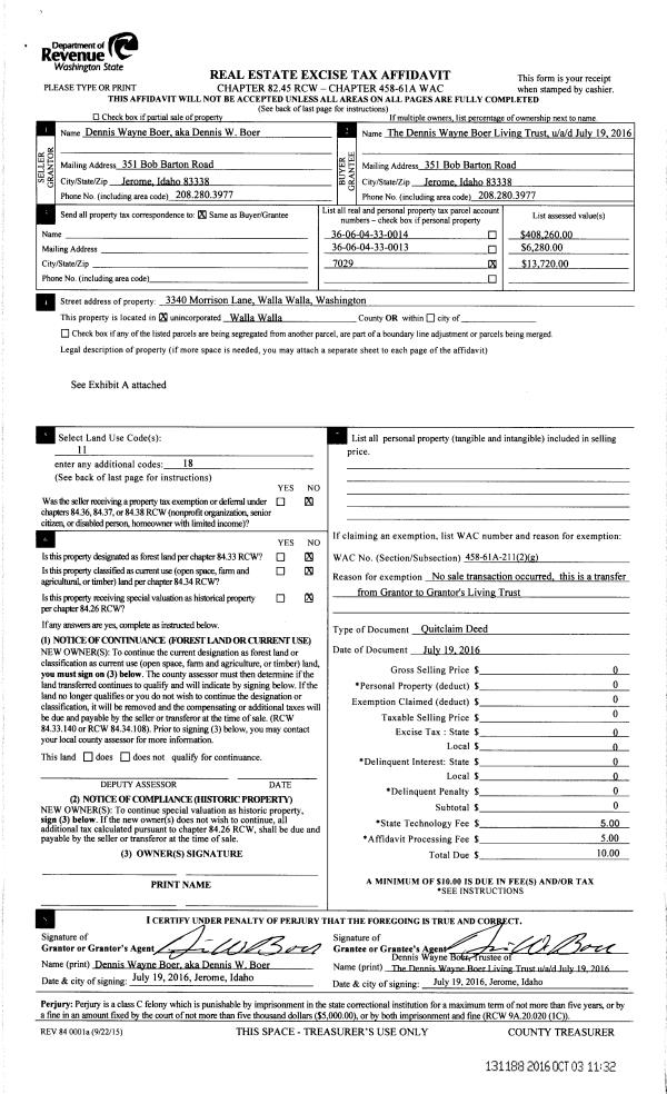 | 5 | 07/19/2016 | QCD | QUIT CLAIM DEED | BOER DENNIS WAYNE | BOER DENNIS WAYNE LIVING TRUST | | | $0.00 | 131188 | 2016-08152 |