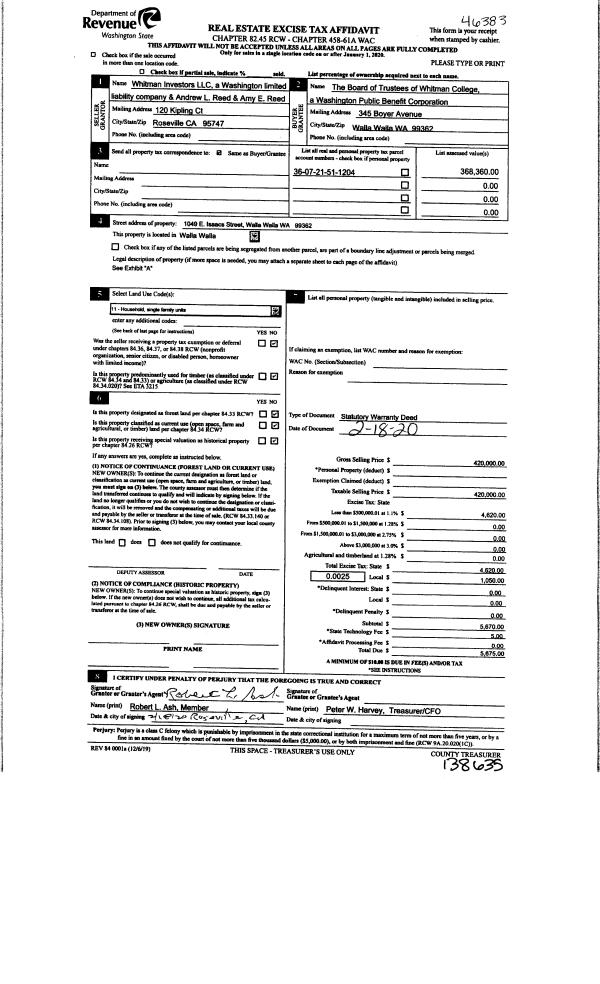 | 1 | 02/19/2020 | SWD | STATUTORY WARRANTY DEED | WHITMAN INVESTORS LLC 55% | WHITMAN COLL BOARD OF TRUSTEES | | | $420,000.00 | 138635 | 2020-01535 |