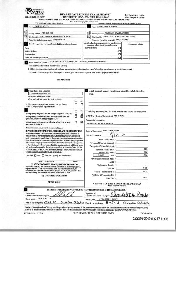 | 3 | 08/17/2012 | WARRANTY D | WARRANTY DEED | BOUTA, DALE W | BOUTA, CHARLOTTE A | | | | 0 | CC #12-3-00091-8 |