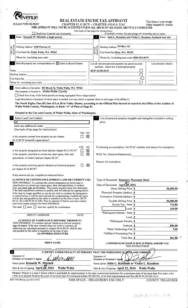 | 1 | 04/22/2016 | SWD | STATUTORY WARRANTY DEED | MITCHELL KENNETH | KNUDSON JOHN & VICKIE | | | $56,000.00 | 130085 | 2016-03015 |