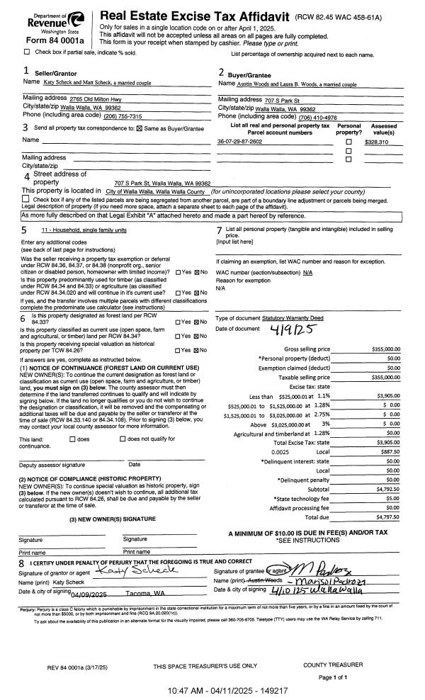 | 1 | 04/11/2025 | SWD | STATUTORY WARRANTY DEED | SCHECK KATY & MATT | WOODS AUSTIN & LAURA B | | | $355,000.00 | 149217 | 2025-01917 |