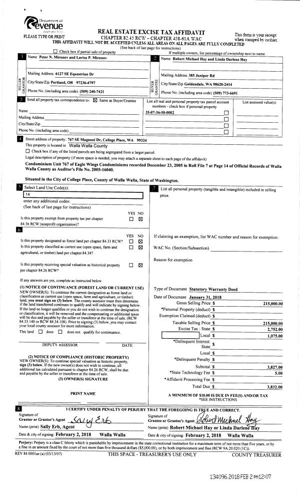 | 1 | 02/02/2018 | SWD | STATUTORY WARRANTY DEED | MIRONOV PETER N & LARISA P | HAY ROBERT MICHAEL & LINDA DARLENE | | | $215,000.00 | 134096 | 2018-00934 |