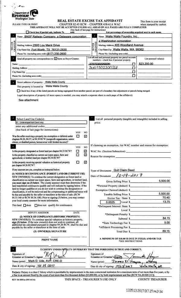 | 2 | 10/27/2017 | QCD | QUIT CLAIM DEED | BNSF RAILWAY COMPANY | WALLA WALLA FOUNDRY INC | | | $5,500.00 | 133513 | 2017-08632 |