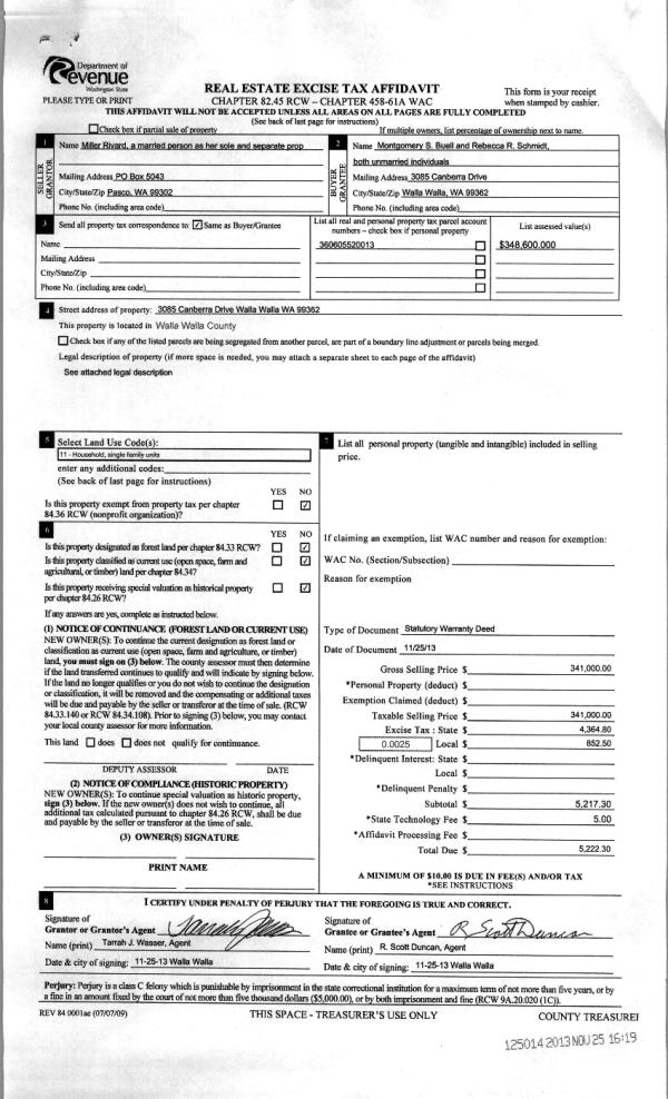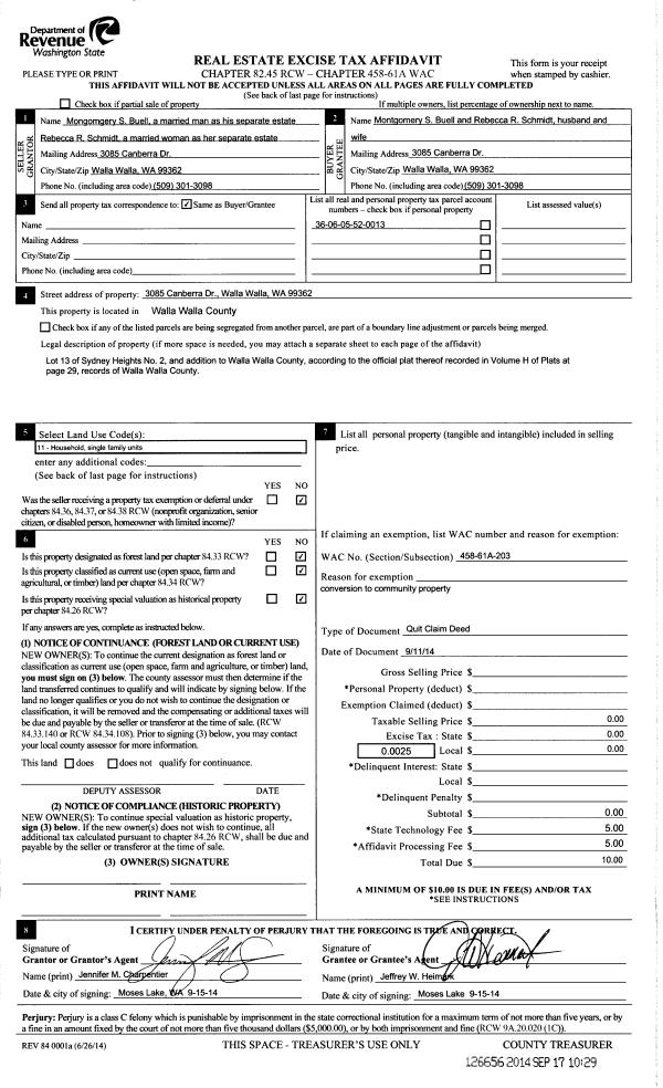 | Mailing Address: | REBECCA R SCHMIIDT 3085 CANBERRA DR WALLA WALLA, WA 99362 | % Ownership: | 100.0000000000% |