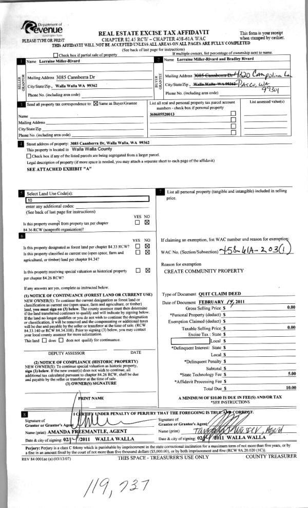 | 3 | 03/02/2011 | QCD | QUIT CLAIM DEED | RIVARD, BRADLEY | MILLER-RIVARD, LORRAINE | | | | 119827 | 2011-01920 |