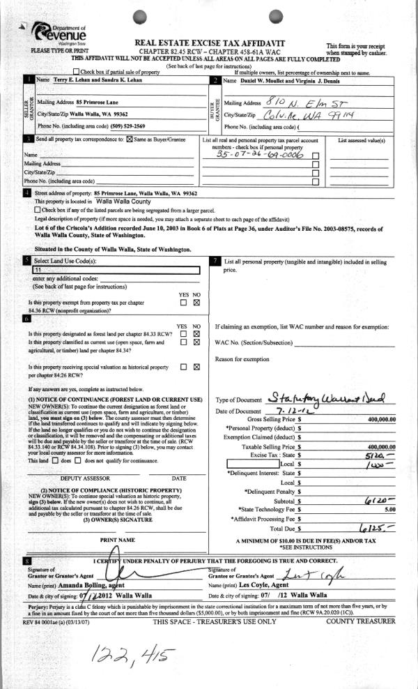 | 2 | 07/31/2012 | WARRANTY D | WARRANTY DEED | LEHAN, TERRY E & SANDRA K | MOULLET, DANIEL W | | | $400,000.00 | 122415 | 2012-06497 |