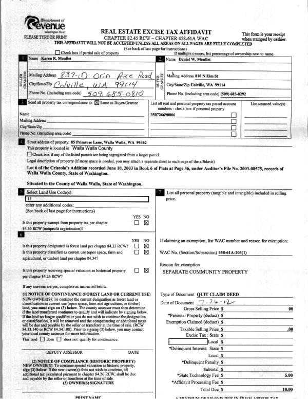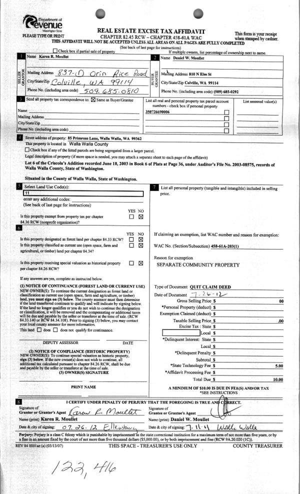 | 3 | 07/31/2012 | QCD | QUIT CLAIM DEED | MOULLET, KAREN R | MOULLET, DANIEL W | | | $0.00 | 122416 | 2012-06496 |