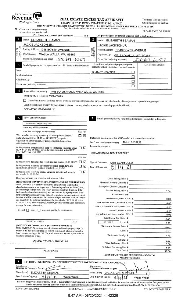 | 1 | 08/20/2021 | QCD | QUIT CLAIM DEED | SEAMAN ELIZABETH | SEAMAN ELIZABETH | | | $0.00 | 142326 | 2021-10246 |