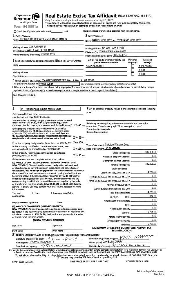 | 1 | 09/05/2025 | SWD | STATUTORY WARRANTY DEED | KRUCKEWITT THOMAS & JEANNIE MASON | MCCURRY DANIEL & STEPHANIE | | | $389,000.00 | 149957 | 2025-05330 |
