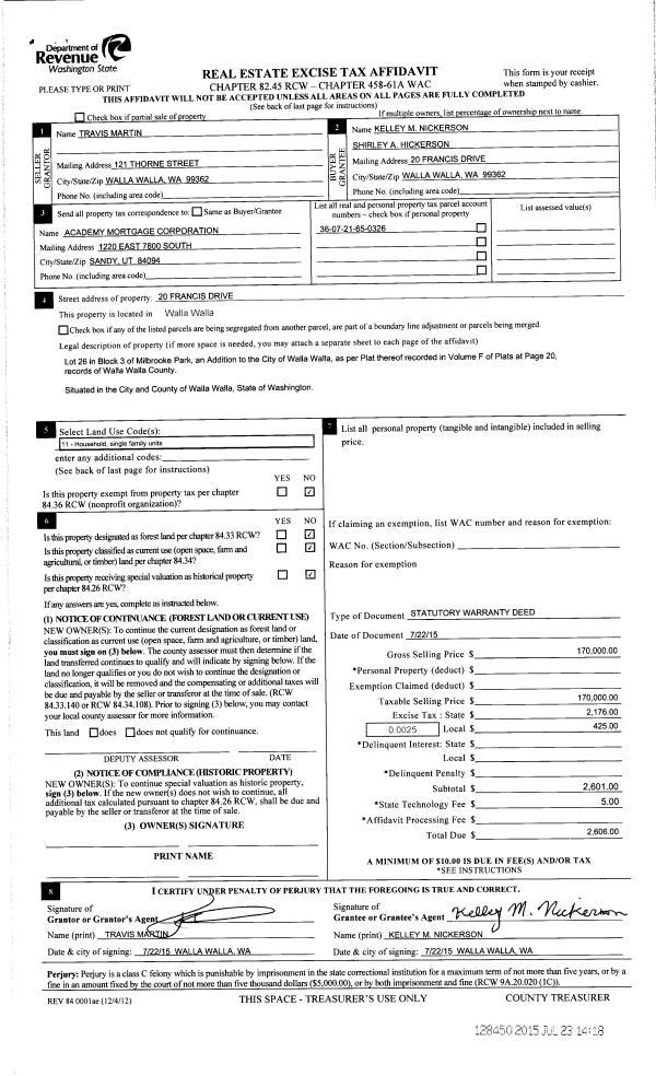 | 5 | 07/23/2015 | SWD | STATUTORY WARRANTY DEED | MARTIN TRAVIS | NICKERSON KELLEY M & SHIRLEY A | | | $170,000.00 | 128450 | 2015-06286 |