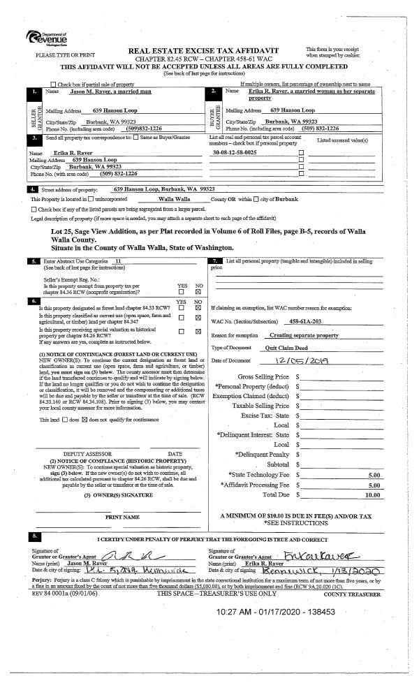 | 1 | 12/05/2019 | QCD | QUIT CLAIM DEED | RAVER JASON M & ERIKA R | RAVER ERIKA R | | | $0.00 | 138453 | 2020-00492 |