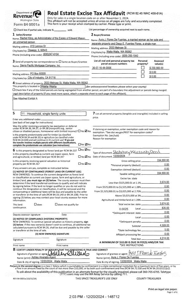 | 2 | 12/20/2024 | SWD | STATUTORY WARRANTY DEED | MASON EDWARD ESTATE OF | FUENTES AURA J FLORES | | | $334,000.00 | 148712 | 2024-07360 |