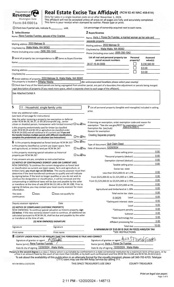| 1 | 12/20/2024 | QCD | QUIT CLAIM DEED | FUENTES RENE FUENTES | FUENTES AURA J FLORES | | | | 148713 | 2024-07361 |