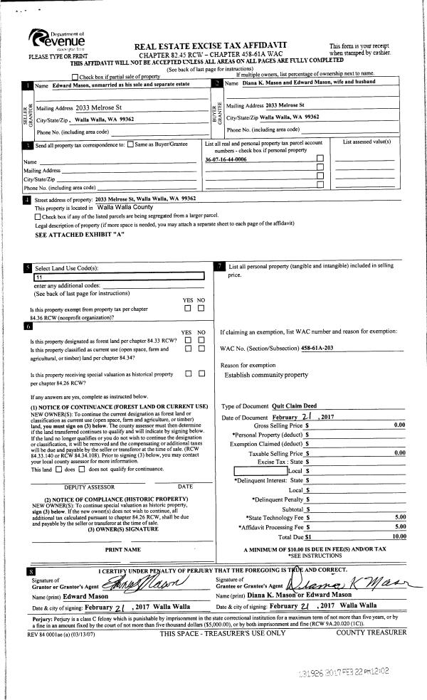 | 4 | 02/21/2017 | QCD | QUIT CLAIM DEED | MASON EDWARD | MASON EDWARD & DIANA K | | | | 131926 | 2017-01428 |