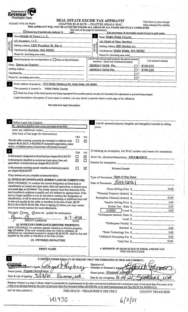 | 1 | 06/07/2021 | EASE | EASEMENT | MIDDLE W FARM LLC | WALLA WALLA COUNTY | | | | 141732 | 2021-06849 |