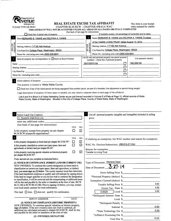 | 5 | 04/11/2014 | WARRANTY D | WARRANTY DEED | YANKE BERNARD B & DELPHIA A | YANKE LIVING TRUST | | | $0.00 | 125709 | 2014-02468 |