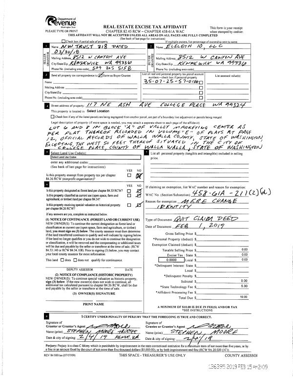 | 2 | 02/04/2019 | QCD | QUIT CLAIM DEED | NW TRUST 318 | ELELETH 10 LLC | | | $0.00 | 136395 | 2019-01011 |