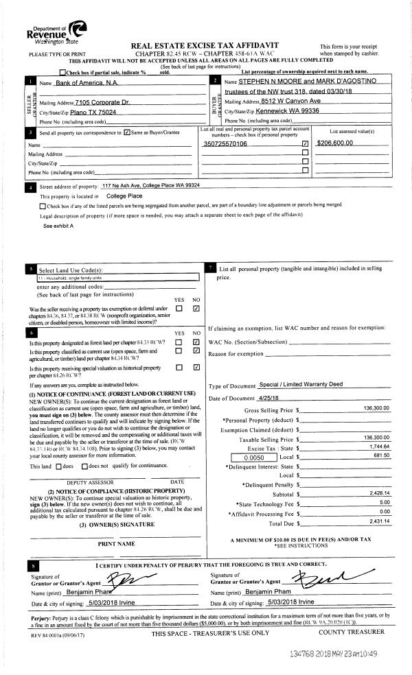 | 3 | 05/23/2018 | SWP | Special Warranty Deed | BANK OF AMERICA | NW TRUST 318 | | | $136,300.00 | 134768 | 2018-04063 |