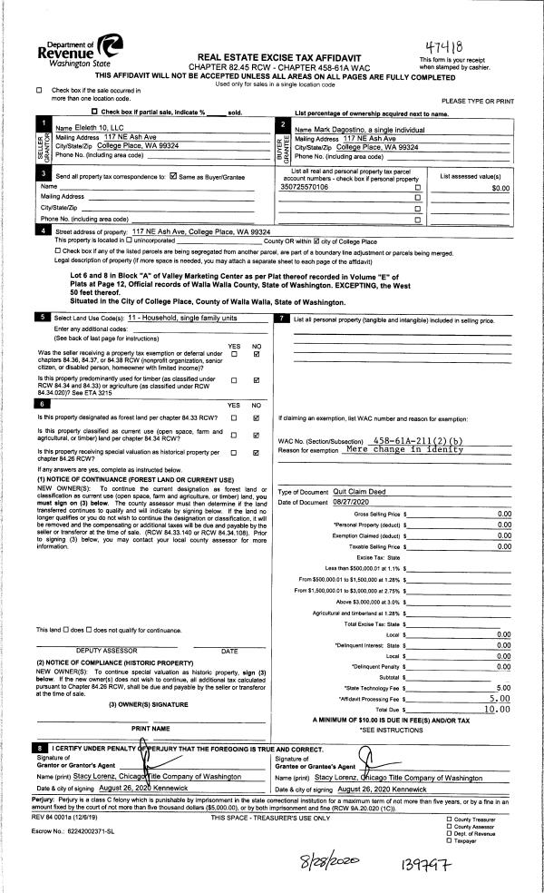 | 1 | 08/28/2020 | QCD | QUIT CLAIM DEED | ELELETH 10 LLC | DAGOSTINO MARK | | | | 139797 | 2020-08687 |