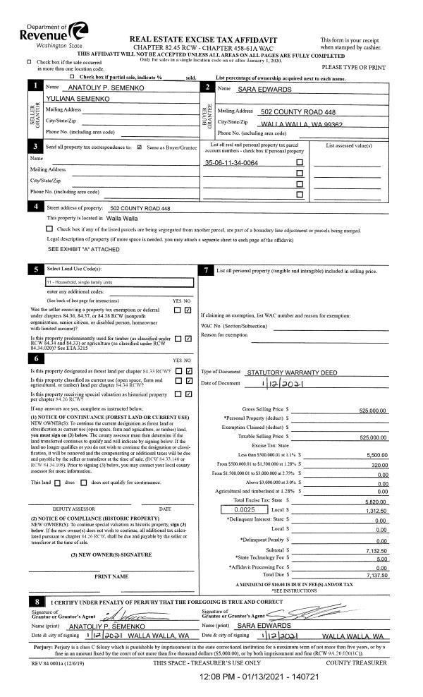 | 1 | 01/13/2021 | SWD | STATUTORY WARRANTY DEED | SEMENKO ANATOLIY P & YULIANA | EDWARDS SARA | | | $525,000.00 | 140721 | 2021-00516 |