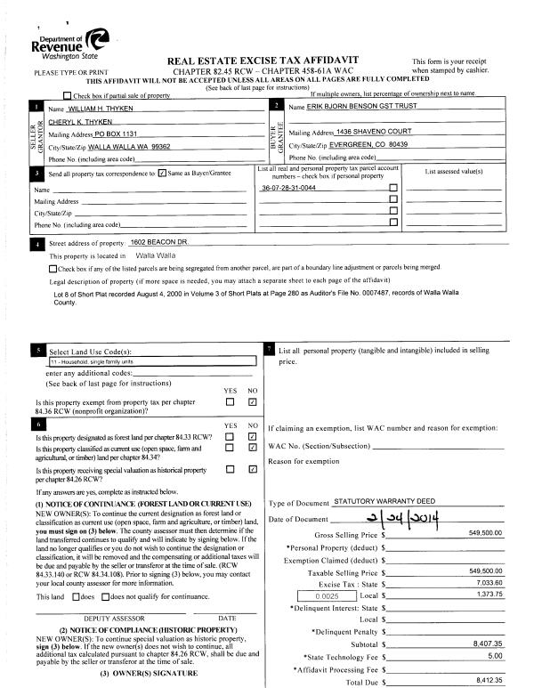 | 1 | 02/24/2014 | SWD | STATUTORY WARRANTY DEED | THYKEN WILLIAM H & CHERYL K | ERIK BJORN BENSON GST TRUST | | | $549,500.00 | 125464 | 2014-01287 |