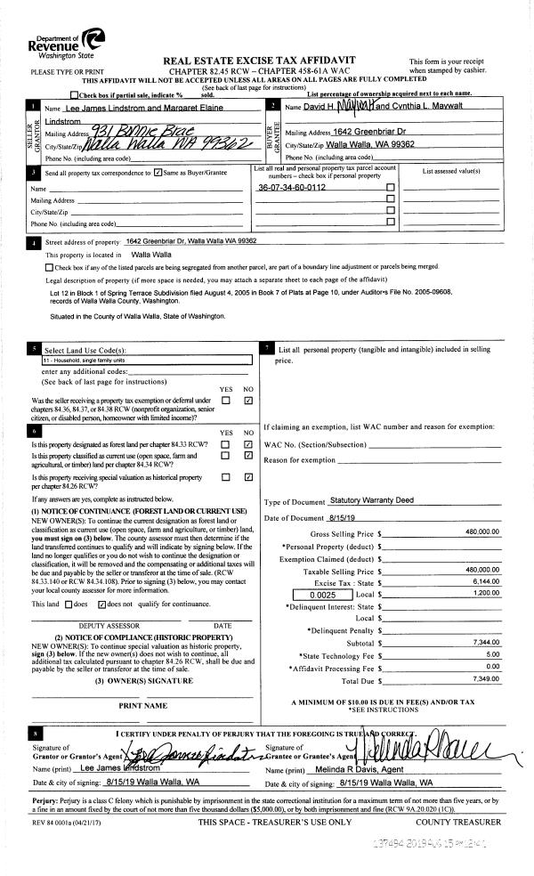 | 1 | 08/15/2019 | SWD | STATUTORY WARRANTY DEED | LINDSTROM LEE JAMES & MARGARET ELAINE | MAYWALT DAVID H & CYNTHIA L | | | $480,000.00 | 137494 | 2019-06162 |