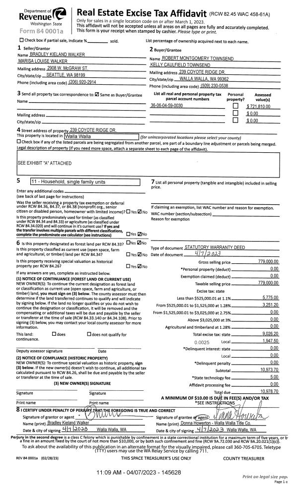 | 1 | 04/07/2023 | SWD | STATUTORY WARRANTY DEED | WALKER BRADLEY KIELAND & MARISA LOUISE | TOWNSEND ROBERT MONTGOMERY & KELLY CAULFIELD | | | $779,000.00 | 145628 | 2023-01799 |