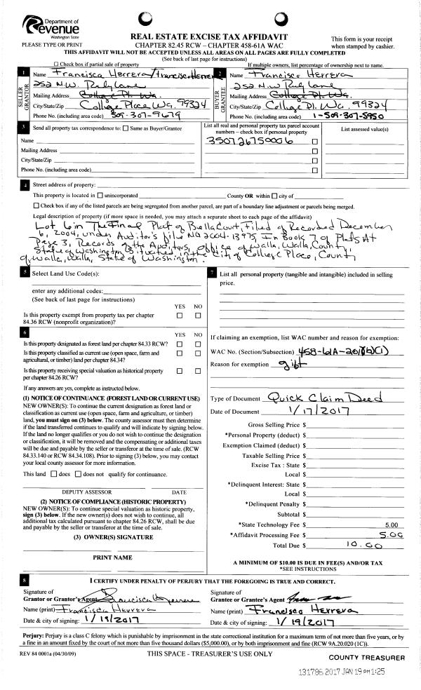 | 4 | 01/19/2017 | QCD | QUIT CLAIM DEED | HERRERA FRANCISCO | HERRERA FRANCISCO | | | $0.00 | 131786 | 2017-00490 |