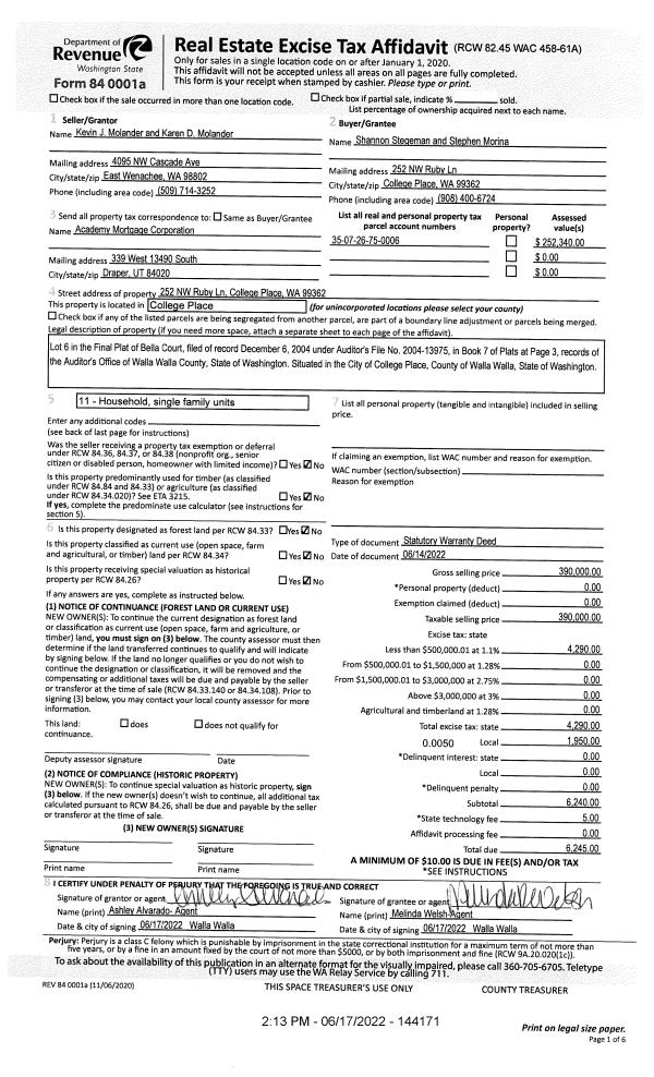 | 2 | 06/17/2022 | SWD | STATUTORY WARRANTY DEED | MOLANDER KEVIN J & KAREN D | STEGEMAN SHANNON & STEPHEN MORINA | | | $390,000.00 | 144171 | 2022-05167 |