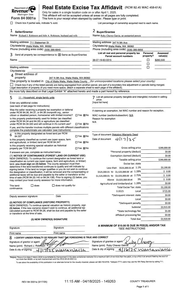 | 1 | 04/18/2025 | SWD | STATUTORY WARRANTY DEED | ROBINSON RICHARD J & JULIE A | GARCIA RUBY CHAVEZ | | | $290,000.00 | 149263 | 2025-02075 |