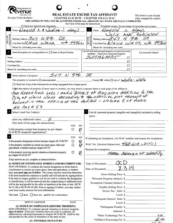 | 7 | 02/03/2014 | QCD | QUIT CLAIM DEED | HAYS HAROLD L | HAYS HAROLD L | | | | 125369 | 2014-00839 |