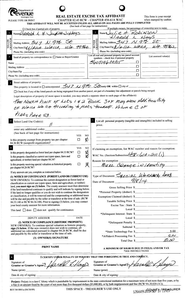 | 6 | 09/08/2014 | SWP | Special Warranty Deed | HAYS HAROLD L | | | | | 126609 | 2014-06619 |