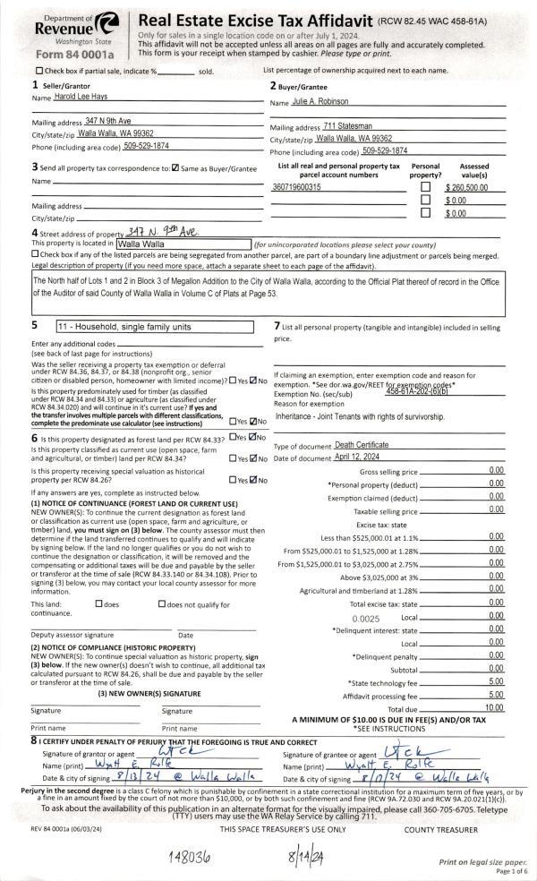 | 5 | 08/14/2024 | DEATH CERT | DEATH CERTIFICATE | HAYS HAROLD L | ROBINSON JULIE A | | | | 148036 | 2024-04540 |