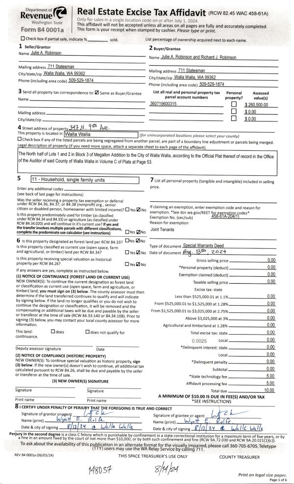 | 2 | 08/14/2024 | WARRANTY D | WARRANTY DEED | ROBINSON JULIE A | ROBINSON RICHARD J & JULIE A | | | | 148037 | 2024-04539 |
