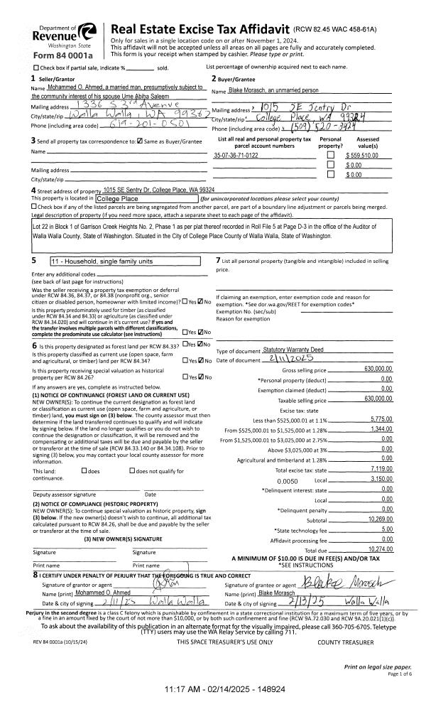 | 1 | 02/14/2025 | SWD | STATUTORY WARRANTY DEED | AHMED MOHAMMED O | MORASCH BLAKE | | | $630,000.00 | 148924 | 2025-00776 |