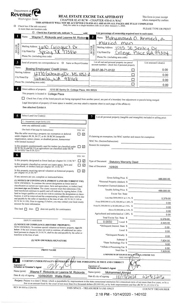| 2 | 10/14/2020 | SWD | STATUTORY WARRANTY DEED | RICKORDS WAYNE F & LEANNE M | AHMED MOHAMMED O | | | $489,000.00 | 140102 | 2020-10637 |