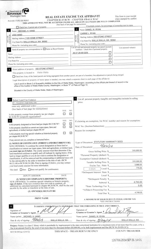 | 1 | 09/26/2014 | SWD | STATUTORY WARRANTY DEED | HAND MICHAEL H & JODI | RYAN DANIEL W & CARRIE L | | | $310,000.00 | 126706 | 2014-07067 |