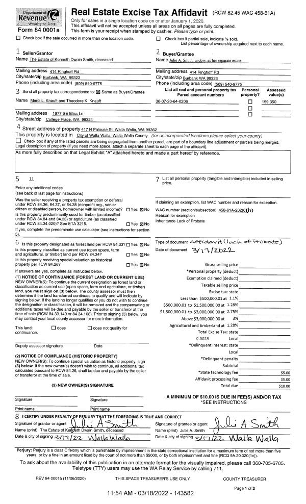 | 2 | 03/18/2022 | LOPA | LACK OF PROBATE AFFIDAVIT | SMITH KENNETH DWAIN ESTATE OF | SMITH JULIE A | | | | 143582 | 2022-02302 |