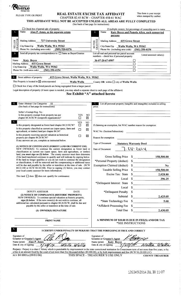 | 2 | 07/30/2014 | SWD | STATUTORY WARRANTY DEED | JONES ALAN P | BOYCE KATY | | | $158,500.00 | 126349 | 2014-05405 |