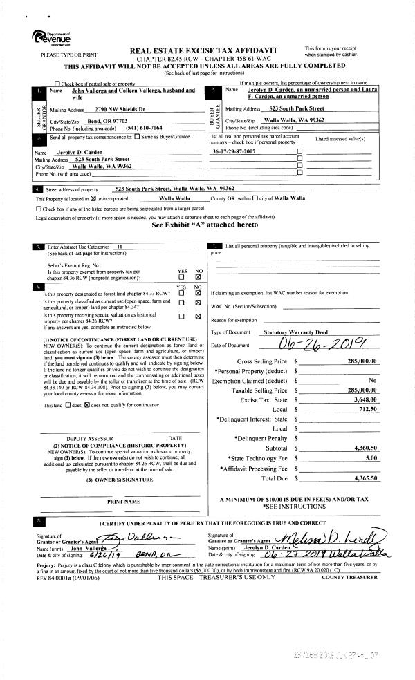 | 2 | 06/27/2019 | SWD | STATUTORY WARRANTY DEED | VALLERGA JOHN & COLLEEN | CARDEN JEROLYN D | | | $285,000.00 | 137168 | 2019-04566 |