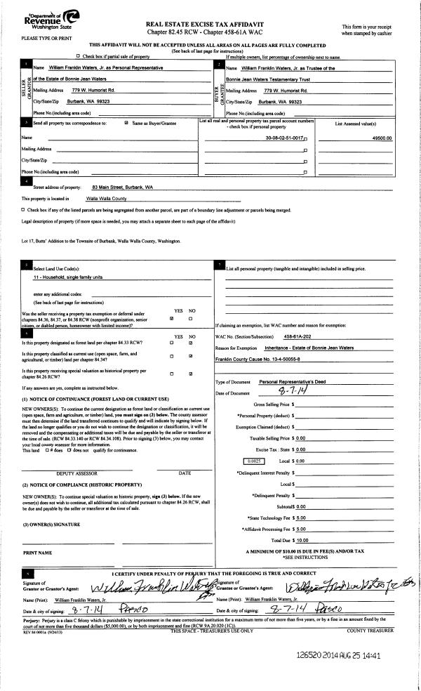 | 3 | 08/25/2014 | DPR | DEED OF PERSONAL REPRESENTATIVE | WATERS BONNIE | THE BONNIE JEAN WATERS TESTAMENTARY TRUST | | | | 126520 | 2014-06178 |