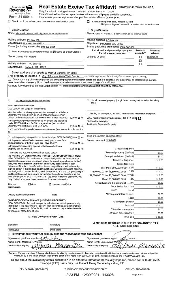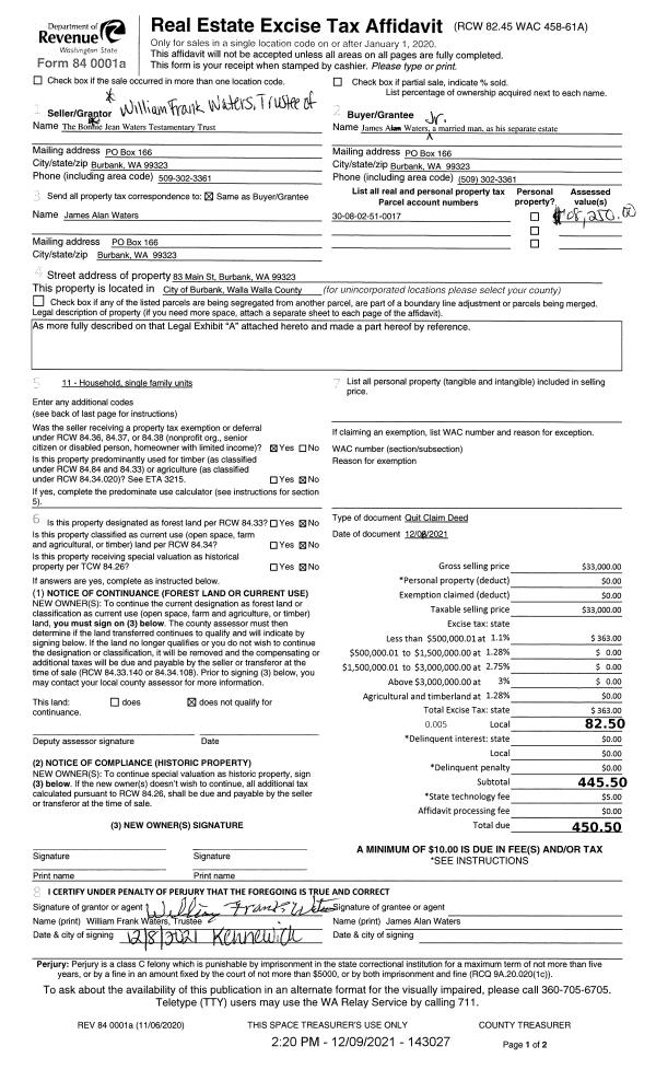 | 2 | 12/09/2021 | QCD | QUIT CLAIM DEED | THE BONNIE JEAN WATERS TESTAMENTARY TRUST | WATERS JAMES A JR | | | $33,000.00 | 143027 | 2021-14510 |