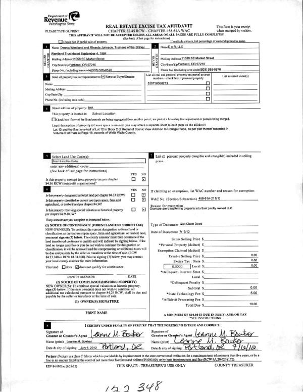 | 2 | 07/17/2012 | QCD | QUIT CLAIM DEED | WENTLAND, SHIRLEY TRUST | D n R LLC | | | $0.00 | 122348 | 2012-06017 |